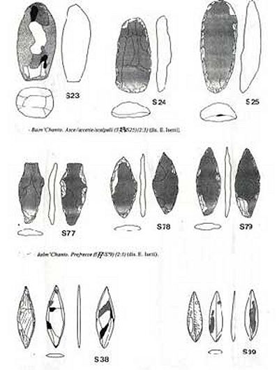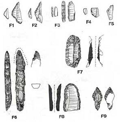 Tra i primi troviamo due grattatoi, una punta di freccia a forma di losanga doppia e una particolare punta (figura F6), della quale si sono verificati ritrovamenti anche in siti svizzeri, francesi e in Val d'Aosta