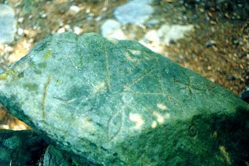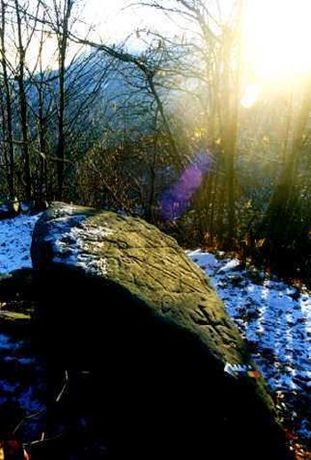 Beaucoup de petites cupules et d'autres signes, très effacés et de lecture difficile, complètent la composition rupestre.Après une suggestion du collègue Mr. Léo Dubal, le 21 Décembre 1998 on a fait une inspection au site de la "Peira Eicrita" pour réléver la position du Soleil levant au Solstice d'Hiver, en connexion avec les pétroglyphes. A 8h45m le Soleil a commencé à darder ses rayons de la ligne de faite du mont "Pan 'd Sucre" qui se trouve sur le flanc méridional de la Vallée du Risagliardo. |