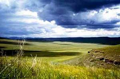 Nuvole temporalesche incombono sul sito di Malaia Boiarskaia Pisanitsa, i cui affioramenti rocciosi istoriati sono visibili sulla destra. Foto: Daniele Seglie. Rain clouds hang on the Malaia Boiarskaia Pisanitsa site, with the engraved rocks on the right. Photo: Daniel Seglie.