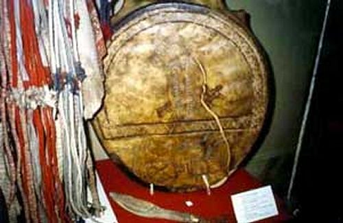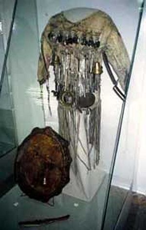 di Novosibirsk. Shamanic dress and drum. The dress is richly adorned with