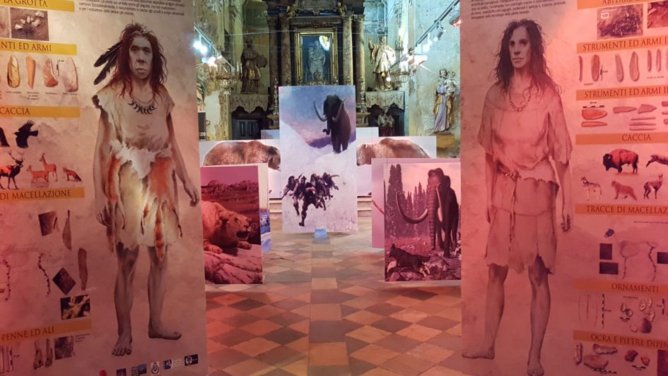 L’allestimento della mostra nella seicentesca Chiesa di S. Agostino, curata dalla Prof. Tere Grindatto, presenta nella navata principale le faune presenti nell’Epoca Glaciale (mammut, rinoceronti lanosi, orsi della caverne, leoni, cavalli e renne, ecc.) con ricostruzioni a grandezza naturale, nonché il confronto delle caratteristiche antropologiche peculiari dell’Homo sapiens e dell’Homo neanderthalensis.